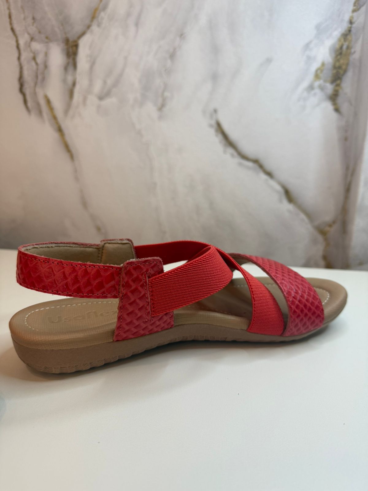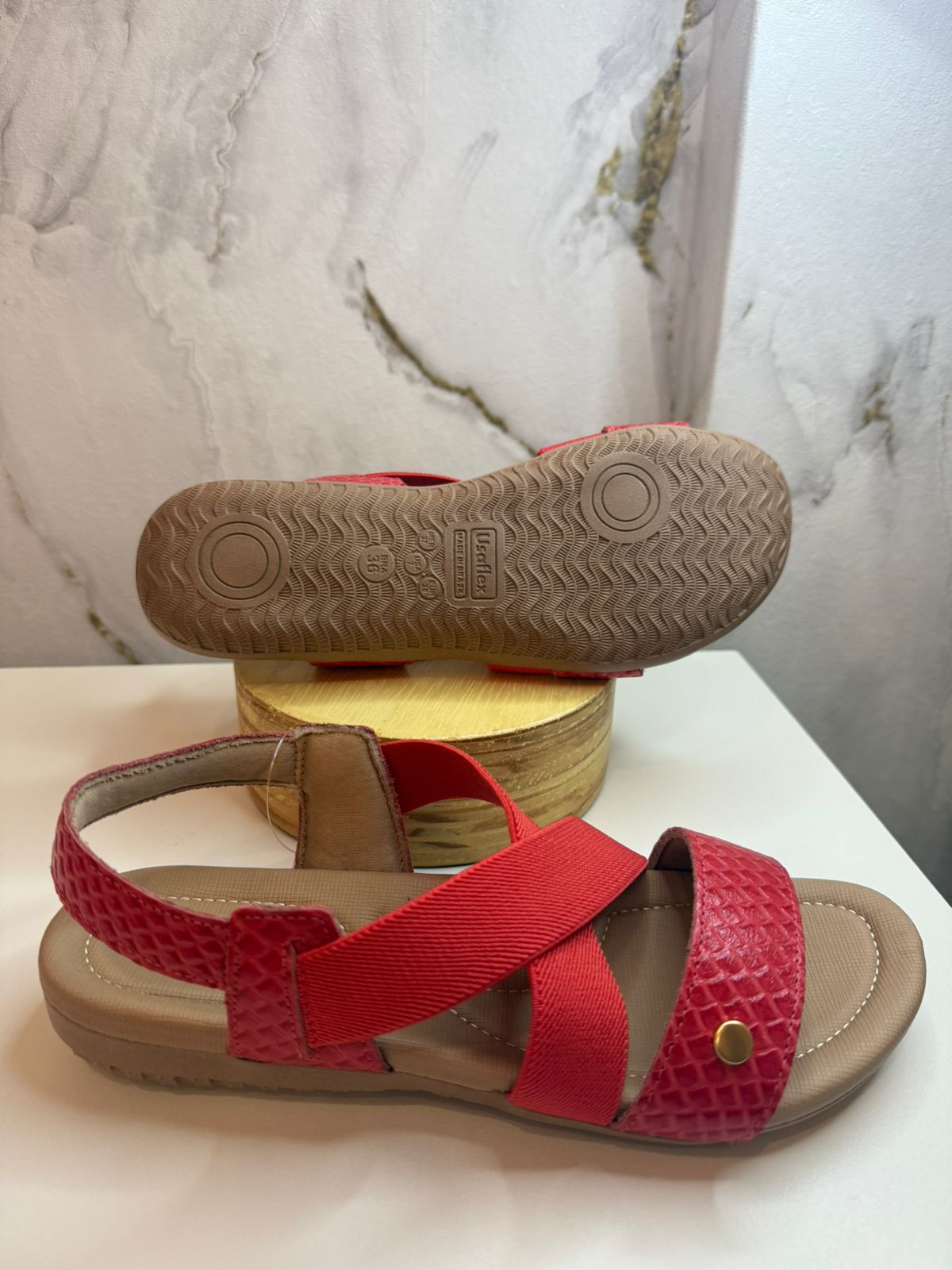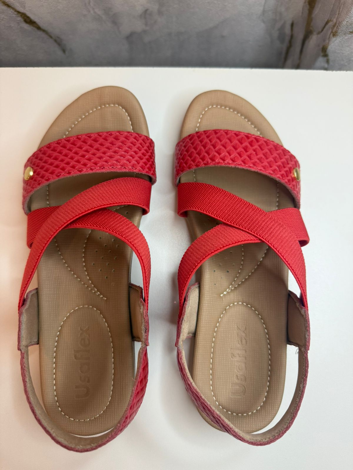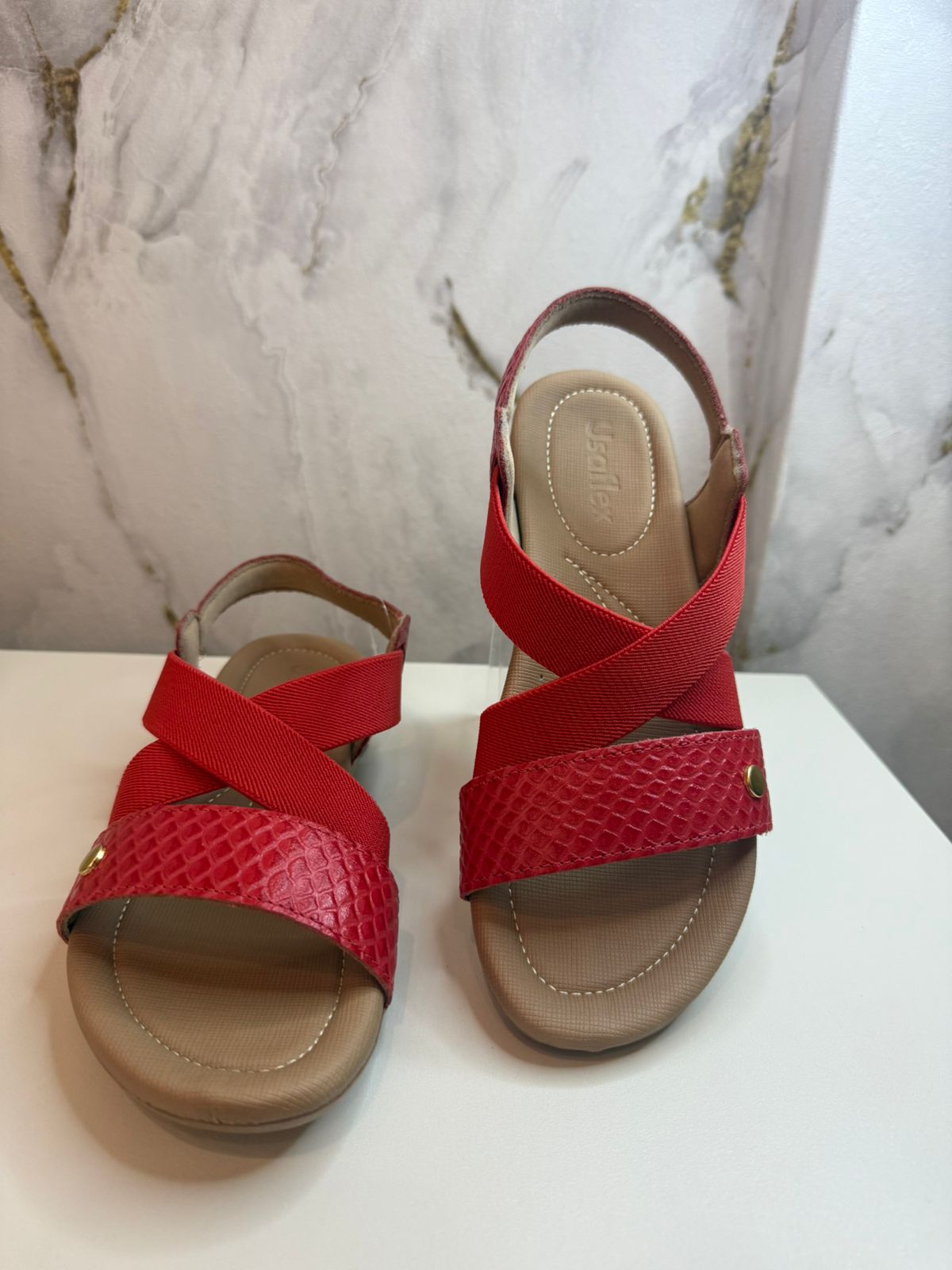 Sandália cabedal em couro calango e datalhe elástico na cor pitanga. O modelo possui tecnologia Calce Fácil, com modelagem inteligente em adaptar o calçado a ergonomia dos pés.