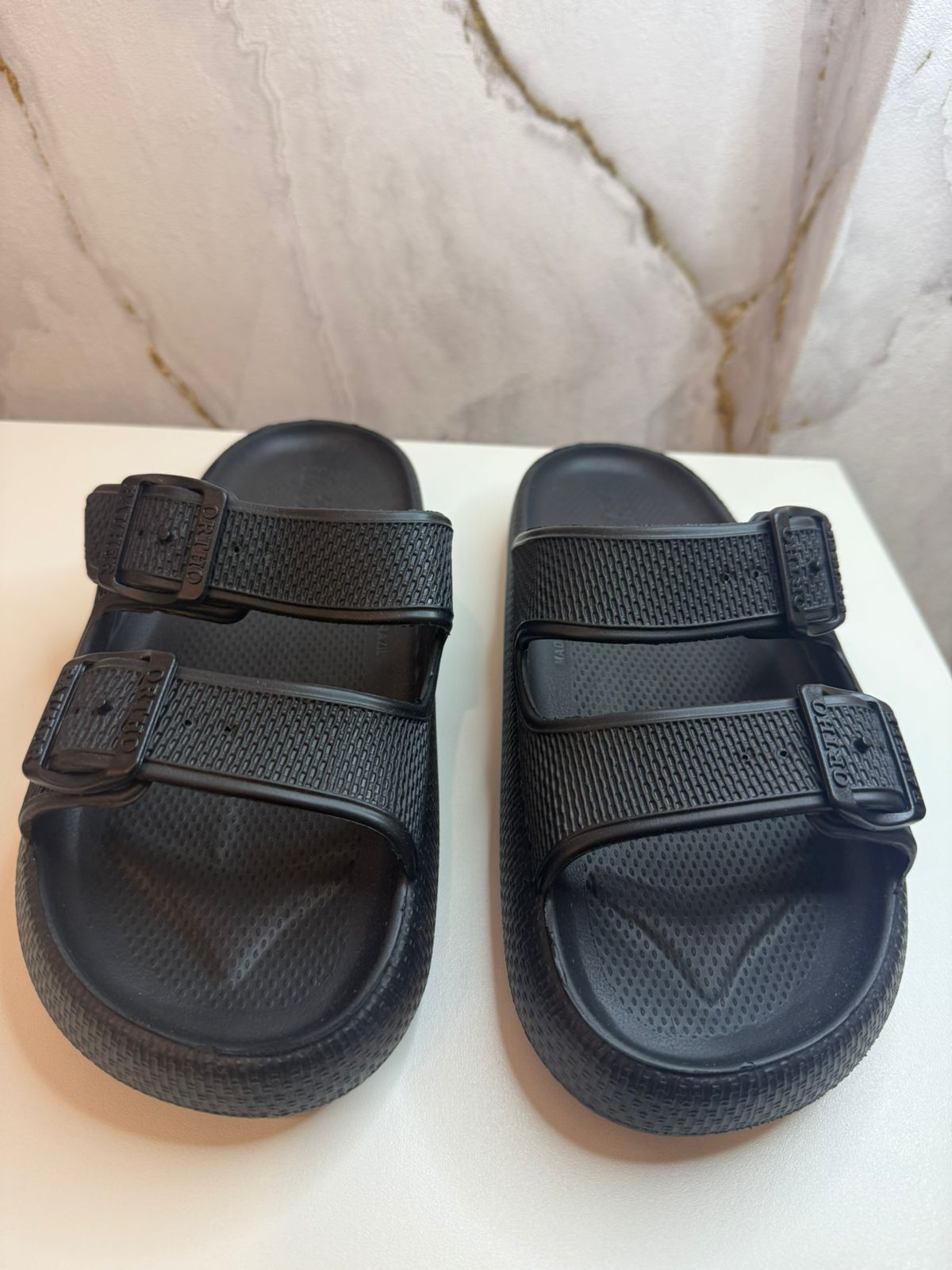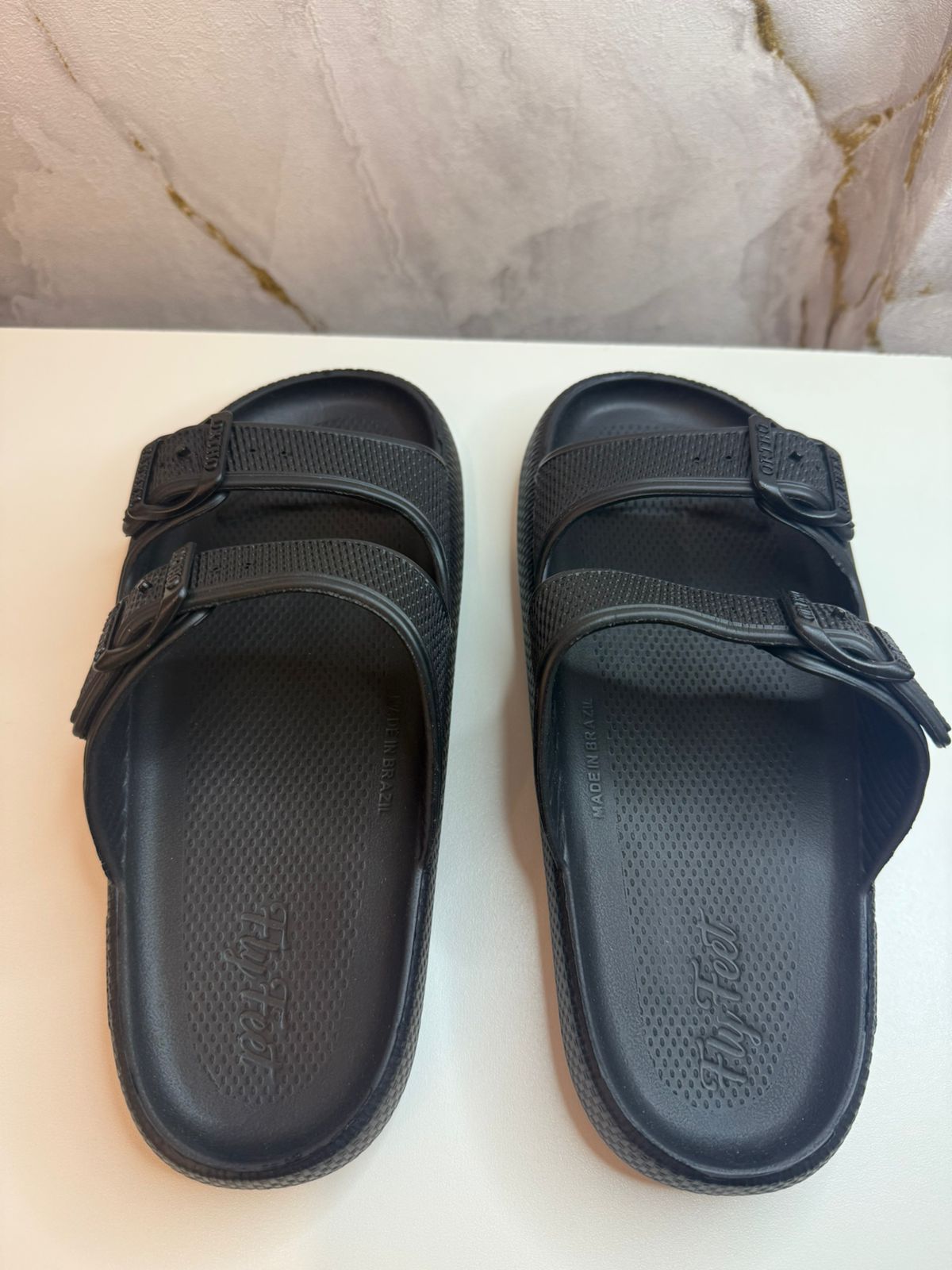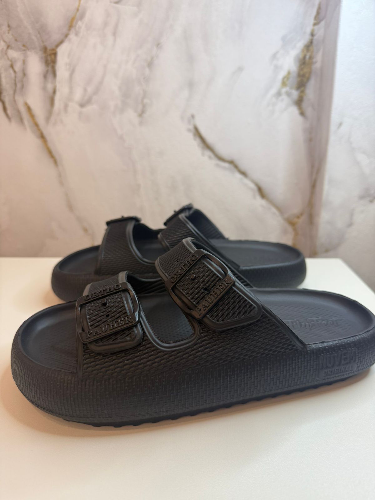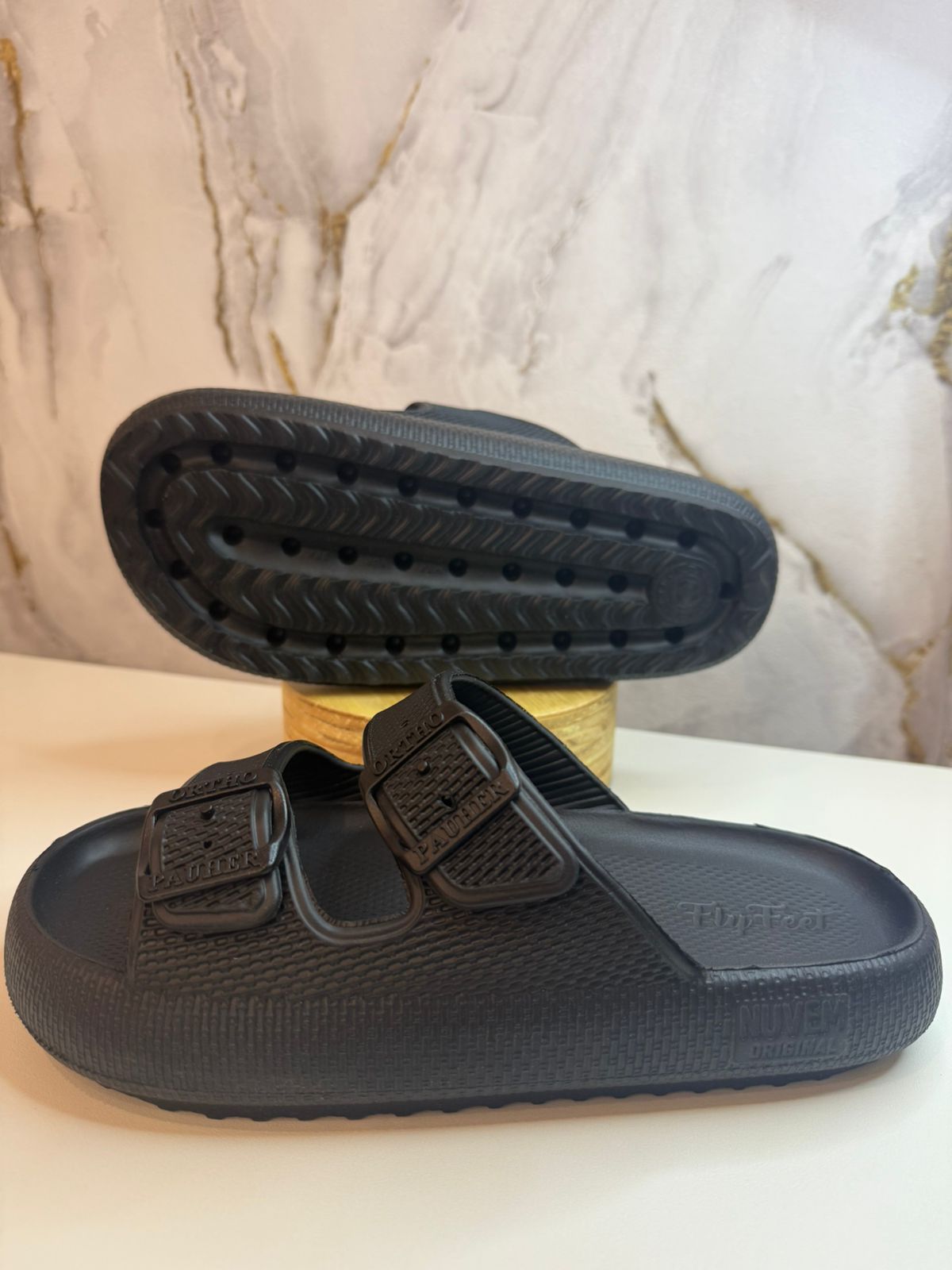 A Sandália Ortopédica Fly Feet Nuvem City possui características anatômicas e singulares no solado que a torna uma palmilha ortopédica única. A Espessura extra de quase 4 cm estimula o contato total da planta dos pés contra a sandália em todas as fases da pisada, e isso equilibra e distribui o peso por toda a região plantar diminuindo uniformemente os pontos de pressão. A ação anti-impacto e maciez somado a modificação na forma de pisar auxiliam diretamente na proteção e prevenção primária e/ou secundária para esporão calcâneo, fascite plantar neuroma de Morton, metatarsalgia, formação de calos, hiperqueratose, alívio nas dores e pressão no calcanhar. Também indicada para deformidades do joanete, possui abertura lateral para alívio da pressão e dores causadas pela protuberância do hallux Valgus. Possui abertura frontal objetivando igualmente o alívio do atrito e dores para dedos em garra. No Preto e no Rosa.